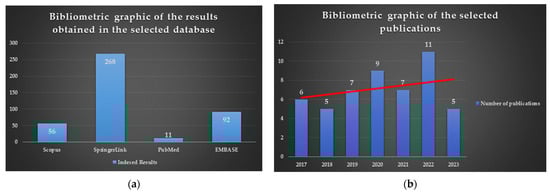 (a) Bibliometric graphic of the indexed results obtained from Scopus, SpringerLink, PubMed, and EMBASE databases; (b) Bibliometric graphic of the selected publications for this review, based on the publication year. The red line represents the increasing interest in the topic of thiazoles in antimicrobial hybrid compounds.