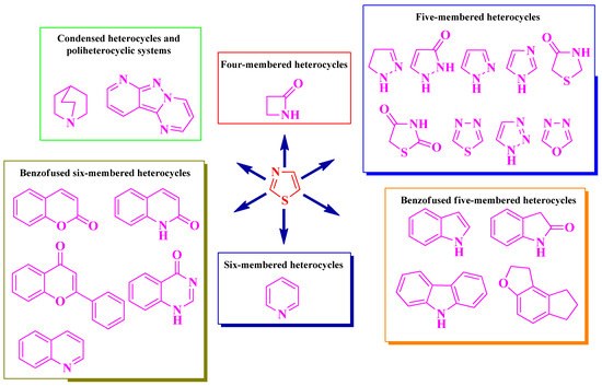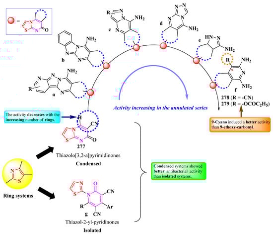 The selected papers were organized based on the nature of heterocycles that were clubbed with thiazole. Additionally, they were ordered by their size, starting with the smallest heterocycles and finishing with polyheterocyclic systems (Figure 3). This offered an overview of how antimicrobial activity may also be affected by this aspect. It is worth mentioning that no research on antimicrobial thiazoles clubbed with three-membered heterocycles was available in the literature in the specified timeframe. Thus, classification started with the four-membered group of heterocycles.