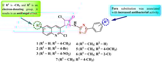 Desai et al. reported the design and synthesis of a series of 4-(quinolin-3-yl)-1-(thiazol-2-yl)-amino-azetidin-2-ones (Figure 4) with two points of variation: the sixth position of the quinoline ring (R1) and the phenyl from the fourth position of the thiazole ring (R2) [13]. Depending on each case, the quinoline ring can be unsubstituted (1–3) or substituted with a methyl group (4–7) in the sixth position. Similarly, the thiazole ring can be either unsubstituted (4) or substituted with electron-donating (1, 5, and 7) or electron-withdrawing groups (2, 3, and 6) in the fourth position [13].