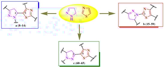 Based on the structures found, it is possible to conclude that there is one general scaffold consisting of both heterocycles linked directly but in different positions. Therefore, three types of linking patterns have been identified: the fifth position of the thiazole ring to the fifth position of the 2-pyrazoline ring [15], the second position of the thiazole ring to the first position of the 2-pyrazoline ring [16,17,18,19,20,21,22,23], and the fifth position of the thiazole ring to the third position of the 2-pyrazoline ring [24] (Figure 5).