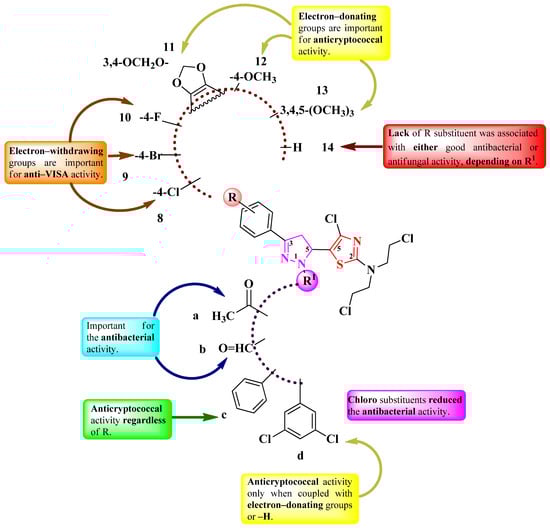 SAR studies revealed that the nature of the substituents on 2-pyrazoline (a–d) and phenyl (8–14) were the most important for antibacterial and antifungal activities (Figure 6) [15]. The phenyl substituent from the first position of the 2-pyrazoline ring (c) conferred anticryptococcal activity regardless of the other substituents (8c–14c), while the 3,5-dichlorophenyl substituent (d) was conditioned by electron-donating groups, particularly methoxy (12d) or trimethoxy (13d), or no substituent at all (14d) on the phenyl ring from the third position of the 2-pyrazoline ring. It is worth mentioning that the 3,5-dichlorophenyl substituent is found in the structure of some important antifungal azoles like miconazole, ketoconazole, or itraconazole. However, the situation is the opposite for antibacterial activity. The 3,5-dichlorophenyl substituent abolished the antibacterial effect, while, for phenyl-substituted derivatives, it was very low. The best activity was observed when small substituents in R1 were present, like acetyl (a) and formyl (b). Another important aspect is that the presence of chloro (8a and 8b), bromo (9a and 9b), and fluoro (9c) substituents or no substituents (14b) increased activity against VISA (Figure 6) [15]. No potential target was reported by the authors.