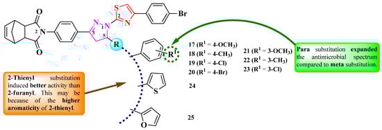 SAR studies of this series showed that aryl substitution induced better activity compared to hetaryl substitution (Figure 8). Thus, in the aryl-substituted derivatives, para-substitution (17–20) favorized overall better activity compared to meta-substitution (21–23). The position of the R1 substituent was found to be more important than their nature, as substitution in para with both electron-withdrawing and electron-donating groups yielded similar activities [17]. In the case of compounds 24 and 25, bearing 2-thienyl and 2-furanyl substituents, a broader activity spectrum was observed for 24, which could be attributed to the higher aromaticity of 2-thienyl compared to 2-furanyl substituent, making it suitable for the bioisosteric substitution of phenyl rings [17]. No potential target was reported by the authors.