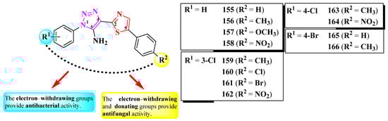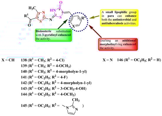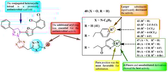 SAR studies pointed out that the heterocyclic tetrad induced promising overall antibacterial and antifungal activities (Figure 10) [20]. An additional aryl substituent (42–46 and 48–51) in the thioether series was essential for these activities. Switching to a hetaryl substituent, 3-pyridinyl (47), decreased the activity. The substituents of aryl were also an important factor in determining antibacterial and antifungal strengths. Thus, a small halogen substituent, like 4-fluoro (46 and 49), induced excellent activity, while larger substituents, such as 2-trifluoromethyl (44), 4-trifluoromethoxy (45), 4- or 5-chloro (43 and 50), and 4-bromo (51), significantly decreased the activity. Of note, unsubstituted rings (42 and 48) also displayed important activity (Figure 10) [20].