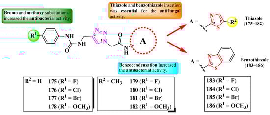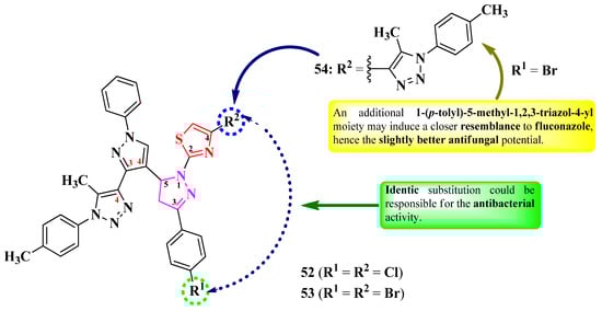 SAR studies of these compounds suggest that the identic substitution (52 and 53) of both 2-pyrazoline and 1,3-thiazole moieties could be responsible for antibacterial activity (Figure 11). Compound 54, containing an additional 1-(p-tolyl)-5-methyl-1,2,3-triazol-4-yl moiety, may induce a closer resemblance to fluconazole than the rest of the compounds by containing two triazole moieties in its structure, hence demonstrating better antifungal activity against C. albicans [21]. No potential target was reported by the authors.