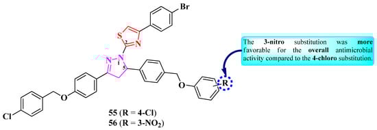 Based on the results, substitution with 3-nitro (56) was more favorable for the overall antimicrobial activity compared to 4-chloro (55) substitution (Figure 12) [22].