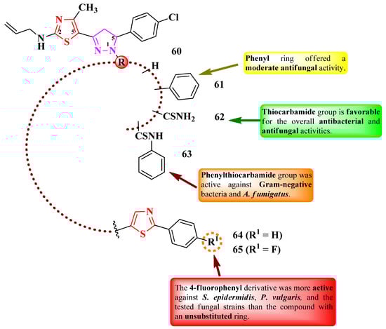 Bondock and Fouda designed some 2-(N-allyl)-5-(2-pyrazolin-3-yl)-thiazole derivatives with various substituents in the first position of the 2-pyrazoline ring (60–65) (Figure 14) [24].