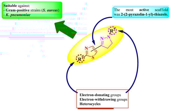 To conclude the results observed in the papers analyzed (Figure 15), clubbing thiazole with 2-pyrazoline to obtain novel antimicrobials should be considered when aiming for compounds active against Gram-positive bacterial strains, especially against S. aureus. Moderate results were observed against Gram-negative bacterial strains, except against K. pneumoniae, where the results were promising [18,19,20,21,24].