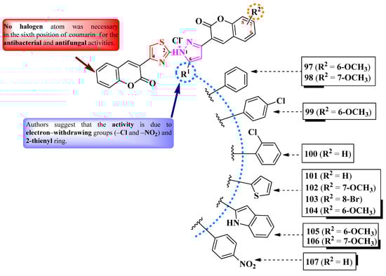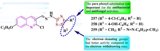 SAR studies of this series showed that R2 substitution was associated with increased antibacterial activity (Figure 4). Electron-donating groups for both R1 and R2 (5 and 7) were associated with antifungal activity [13].