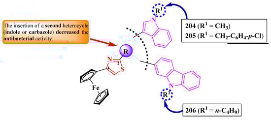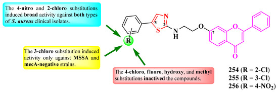 SAR studies of these compounds suggest that acyl group substitution in position 5 of the thiazole ring (34c,d, 35c,d, and 36c,d) only resulted in antibacterial active compounds (Figure 9) [19]. Favorable substituents for the antibacterial activity were acetate (34c and d), anilido (35c and d), and acetyl (36c and d), which was the opposite compared to the compounds by Mansour et al. [19].