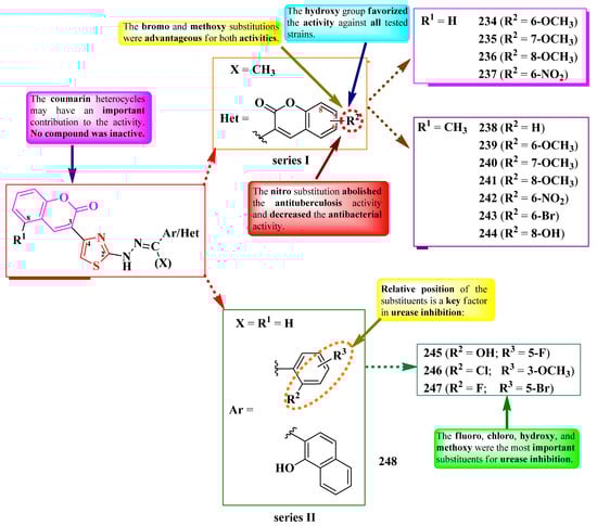- Salar, U.; Qureshi, B.; Khan, K.M.; Lodhi, M.A.; Ul-Haq, Z.; Khan, F.A.; Naz, F.; Taha, M.; Perveen, S.; Hussain, S. Aryl hydrazones linked thiazolyl coumarin hybrids as potential urease inhibitors. J. Iran. Chem. Soc. 2022, 19, 1221–1238. [Google Scholar] [CrossRef]