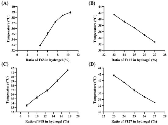 Sample hydrogels (1 mL) with different F127/F68 proportions were prepared in accordance with the fabrication method we mentioned in Section 2.4 in clear Eppendorf tubes, and placed on a magnetic rotor before measurement. Then, the sample tube was dipped into a magnetic stirring water bath at 30 °C and heated at a speed of 1–2 °C/min, while turning on the magnetic stirring. When the magnetic rotor stopped rotating due to gelation, the temperature displayed by the thermometer was recorded as the solution–gelation transition temperature (Tsol-gel).