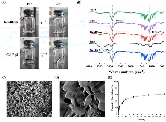 Characterization of hydrogels. (A) Morphology of Gel–Blank and Gel-Rg3. (B) FT–IR spectras of F127, F68, Gel–Blank, Rg3 and Gel-Rg3. (C,D) SEM image of F68/F127 hydrogel at different magnifications. (E) Cumulative release profile of Rg3 from the hydrogel at 37 °C in release medium.