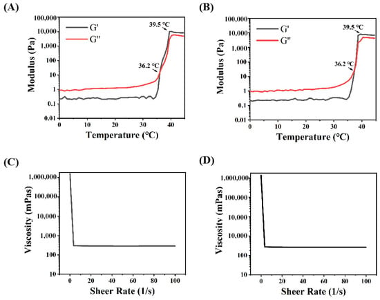 Rheological properties of hydrogels. (A) Storage modulus (G′) and loss modulus (G″) of Gel–Blank with temperature. (B) Storage modulus (G′) and loss modulus (G″) of Gel-Rg3 with temperature. (C) Viscosity of Gel–Blank as a function of shear rate. (D) Viscosity of Gel-Rg3 as a function of shear rate.