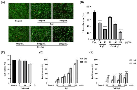On account of the fact that the exposure of drugs at high dosage might lead to damage to a certain degree, the advantages of Gel-Rg3 with a sustained-release profile was measured in vitro. Live/dead staining was used to observe the cytotoxicity of the Gel-Rg3 and Rg3; the distributions of live and dead cells after the administration of various concentrations of drugs for 72 h are displayed in Figure 4A. As we have seen, live cells were presented with green fluorescence after Calcein AM staining, while dead cells were stained red by propidium iodide (PI) due to alterations in cell membrane permeability; a portion of the dead cells could not be shown in the picture because of shedding. A comparison of viable cell densities between groups revealed that the cytotoxicity of Rg3 was concentration-dependent, as a low concentration of Rg3 had less cytotoxicity (Figure 4A). When the concentration of Rg3 reached 50 μg/mL, the proportion of viable cells in the free Rg3 group was 31.06% while the percentage of viable cells treated with Gel-Rg3 at the same concentration still managed to reach 67.57%; even with a four-fold increase in the concentration, the Gel-Rg3 group was able to retain 22.09% of the viable cell area (Figure 4B). Compared with the free Rg3 in an equal concentration, the cell viability of the Gel-Rg3 was preferable, suggesting that the hydrogel material has superior biological safety.