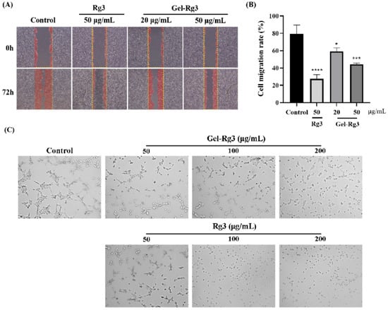 In vitro anti-angiogenesis efficacy of Gel-Rg3. (A) Optical images of HUVECs scratching assays treated with or without Gel-Rg3 and Rg3 (40×). (B) HUVECs migration rate of Gel-Rg3 and Rg3. (C) Optical images of tube formation treated with or without different concentrations of Gel-Rg3 and Rg3 (100×). Data were shown as mean ± SDs (n = 3), * p < 0.05, *** p < 0.001, **** p < 0.0001 vs. control.
