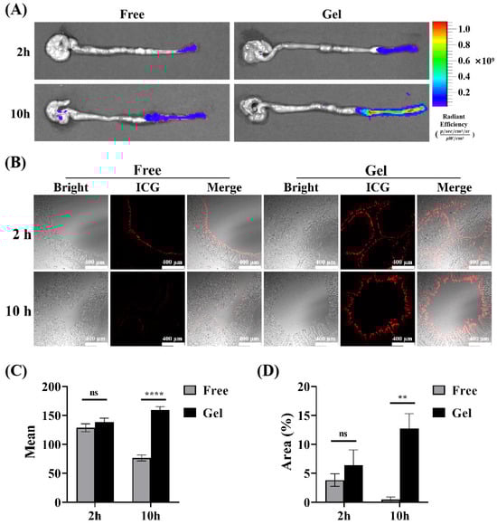 Based on the thermosensitive property of the hydrogel we prepared, it can transition from solution to gelation. Its rheological property, where its fluidity decreases with rising temperature, combined with the bio-adhesion property of poloxamer hydrogels, creates favorable conditions for its retention and adhesion in the gut [37,39,50,51,52,53]. To simulate the actual retention of the gel in vivo, Indocyanine Green (ICG) was encapsulated in the gel for rectal administration, and free ICG solution was used as a control. The results showed that the fluorescence of the intestine in the gel group increased with the passage of time after administration, which was superior to that in the free group, suggesting that the gel has better intestinal retention characteristics (Figure 6A). Subsequently, in order to further explore the penetration and absorption of drugs in the intestine after transrectal administration, the intestine was collected at each time point, and the distal colon was cut off for the frozen section. The fluorescence intensity of the colon tissue section in each group was observed and compared under a fluorescence microscope. Representative fluorescence images are displayed in Figure 6B; the average fluorescence intensity of colon sections in the Gel group increased with time, and its fluorescence intensity reached two times of that in the free ICG group at 10 h (Figure 6C). Similarly, the fluorescence area on the intestinal mucosa of the gel group was much larger (Figure 6D), showing a favorable intestinal retention capacity and drug absorption. Interestingly, the fluorescence intensity of colon sections in the free ICG group dropped significantly. At 10 h, it was nearly zero. This could be because the absorbed drug was partially metabolized over time. Additionally, the unabsorbed drug was likely cleared with the intestinal contents during pre-slice processing. In contrast, the gel has the characteristics of the sustained release of drugs, as the drug loaded in the gel continued to be released slowly and accumulated locally. Therefore, strong fluorescence could still be detected in the intestinal mucosa at 10 h after administration, which further suggested the advantage of our temperature-sensitive gel in rectal administration.