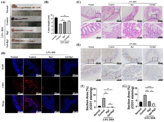 To further investigate the effects of Rg3 and Gel-Rg3 on angiogenesis in IBD in vivo, we labeled the CD31 in the colonic tissue through immunostaining to evaluate the vascular density in the colonic mucosal layer [14]. The results of both immunofluorescence and immunohistochemistry showed that the vascular density in the colon was significantly elevated after DSS-induced in mice, and that the vascular density decreased back to the normal level after treatment with Rg3 or Gel-Rg3, indicating the excellent anti-angiogenic effect of Gel-Rg3 as well as of Rg3 in vivo (Figure 7D,E). The efficacy of Gel-Rg3 was still comparable to free Rg3 even under sustained-release conditions. Combined with the results of the in vivo retention assays, Gel-Rg3 has a longer-lasting efficacy and safety profile, showing the potential to be utilized in practical therapeutic applications at a much lower dosing frequency.