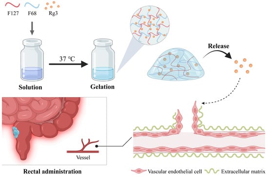 In our study, we aimed to develop and evaluate a novel thermosensitive hydrogel formulation of Ginsenoside Rg3 (Gel-Rg3), designed to leverage its anti-angiogenic properties for the treatment of inflammatory bowel disease (IBD). Our hypothesis was that Gel-Rg3, which transitions from a liquid to a solid state at body temperature (35–37 °C), would enhance drug solubility, provide sustained release and improve therapeutic efficacy and safety compared to conventional treatments. To achieve this, we formulated the hydrogel to adhere within the 37 °C intestinal environment [40], evaluated its physico-chemical properties, tested its safety and pharmacological activity in vitro using human umbilical vein endothelial cells (HUVECs) and assessed its retention capacity and efficacy in vivo by inhibiting angiogenesis. The significance of this study lies in its potential to offer a more effective and safer therapeutic option for IBD by advancing the delivery and effectiveness of Rg3. The schematic representation of our hypothesis is shown below (Scheme 1).