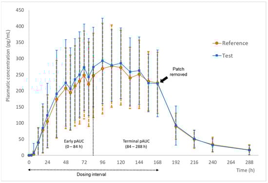 Figure 2 shows the mean plasma concentration versus time calculated for the 52 subjects who successfully completed both study periods and were included in the pharmacokinetic analysis. It is possible to note that the sampling scheme was suitable to elucidate the absorption phase within the dosing interval (0–168 h), as well as the drug elimination (168–288 h) after the patch removal. For pAUC metrics, the early and terminal pAUC were estimated from 0 to 84 h (half of the dosing interval) and 84 to 288 h, respectively.