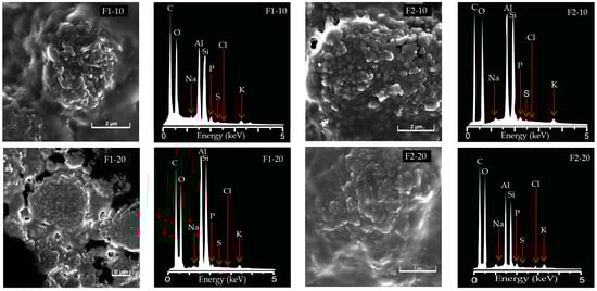 SEM images were obtained with a Dual Beam AMBER X high-performance focused plasma ion beam-scanning electron microscope (FIB-SEM) (Tescan Group a. s., Brno—Kohoutovice, Czech Republic) equipped with a Schottky field emission electron source (hot cathode). Samples were sputter-coated with carbon by means of a sputter-coating Nanotech Polaron-SEMPREP2 (Polaron Equipment Ltd., Watford, UK) before they were examined. EDS was carried out using a ULTIM® MAX 100 microanalyser (Oxford Instruments, High Wycombe Buckinghamshire, UK) with a retractable SDD detector, large active detection surface (100 mm2), energy resolution at 5.9 keV and software AZtec® 5.0 SP1 (Oxford Instruments, High Wycombe Buckinghamshire, UK).