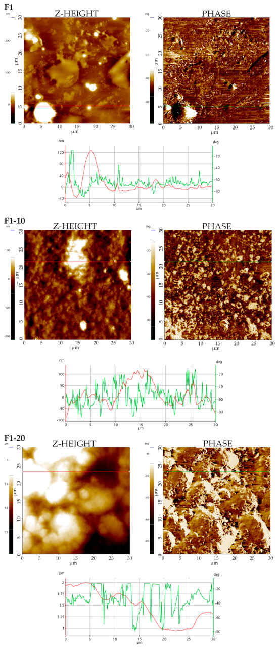 Topographic determinations provided a detailed insight into the surface characteristics of the films. They allowed for a closer examination of surface nano-details and small-scale topographical variations, generating complementary data to SEM observations. Topographic analysis was essential to detect differences in the phase shift of the cantilever’s sinusoidal vibration signal, thanks to surface scanning in an intermittent contact mode (Tapping). The phase shift highlighted light and dark areas with different properties due to the variety of materials in the films.