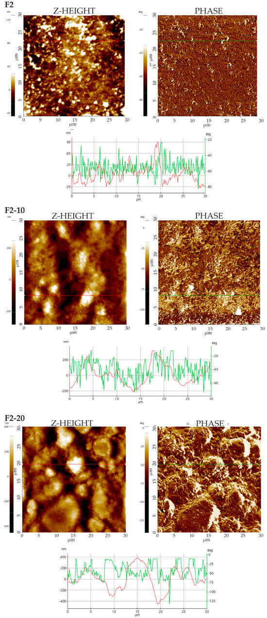 Representative AFM images (TAPPING mode) of F1, F2, and NH-loaded films are shown in Figure 2 and Figure 3. Marked differences were clear in the Z-height (topography) images, displayed as colored maps, with a color bar ascribing the color to Z-height. Concretely, the F1 films were characterized by Z-height values of <100 nm and isolated peaks exclusively between 100 and 200 nm. Contrary to this (see Figure 2), F1-10 and F1-20 films were characterized by greater Z-height values in the range of 100 to 200 nm or up to 2 μm, respectively. Increases in solid phase concentration, peaks (light areas), and valleys (dark areas) were observed on the surface. The increase in the Z-height values could be associated with an increase in NH concentrations on the film surface. In Group 2, even low NH concentrations provided a cardboard-like surface and greater Z-height values to the films (Figure 3). This increase in the surface was more evident in the F2-20 film, which was also characterized by greater Z-height values (400 nm). Phase images visualized the phase shift of the sinusoidal cantilever vibration signal, which was affected by the chemical composition of the samples. Images of the F1 and F2 films confirmed the heterogeneity of the samples, which were made by mixing various organic components, mainly CS and HC. A pattern of two phases with different contrasts was also observed in the NH-loaded films, thus confirming the hybrid nature of the formulations. In the films with high concentrations of NHs, i.e., F1-20 and F2-20, light phases prevailed over dark phases, probably due to the NH distributions on the sample surfaces. Alternatively, lighter phases could be ascribed to crystalline phases, while darker phases could be ascribed to phases rich in biomolecules [53].