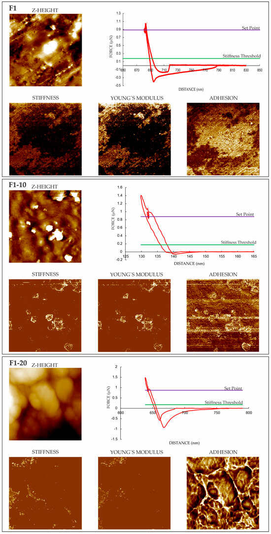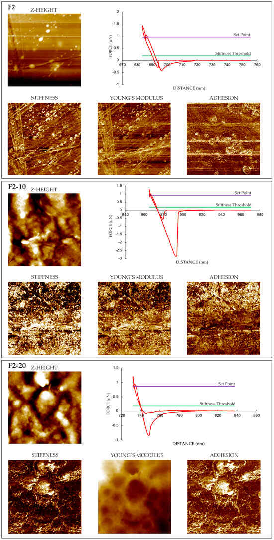 Force spectroscopy: The characterization of the nanomechanical properties of the films was carried out by using the gentle PinPoint mode to acquire reproducible and reliable topography, stiffness, adhesion and elastic module maps [56]. The procedure consisted of the following: (i) the XY scanner stopped during acquisition; (ii) the tip approached the surface, measured mechanical properties and retracted from the surface over a few ms (4 ms) to achieve an interaction force preset (10 to 20 nN; and (iii) recorded the approach height maintaining the Z distance.
