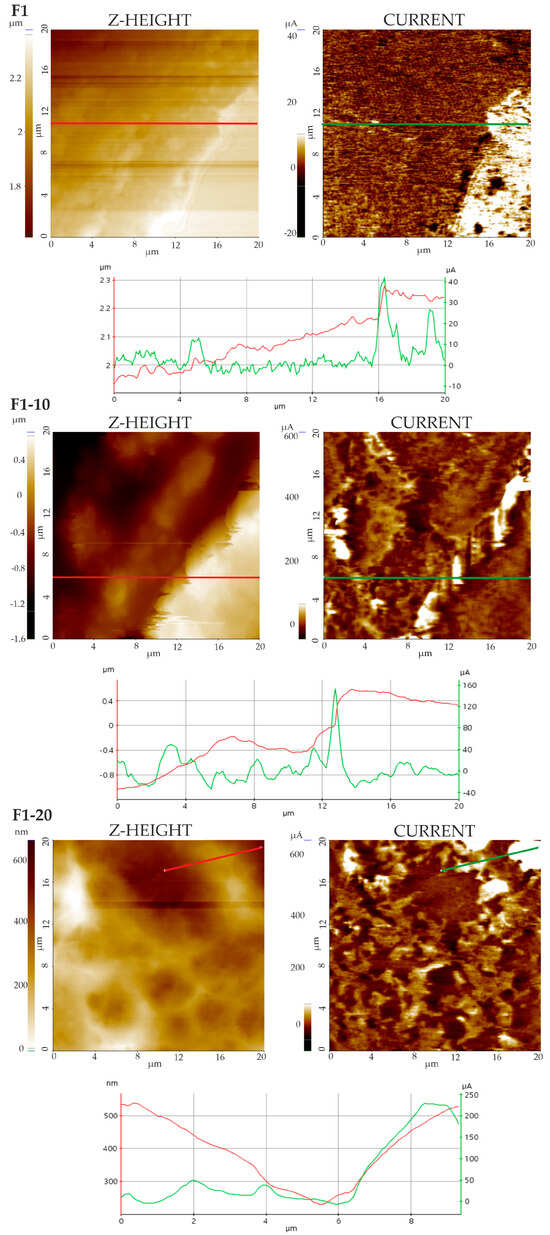 PinPoint c-AFM height image of Group 1 films, including the following: Z-height image; current signal at +1 V and Dual Line profiles from the Z-height image (red line) and current map (green line).