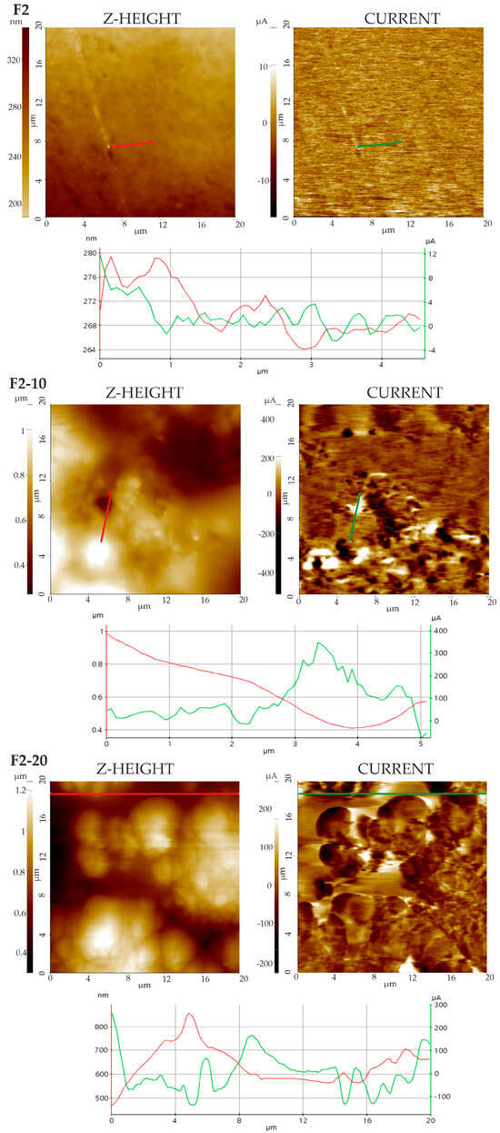 c-AFM measurements were carried out to check the hybrid nature of the films (NH loading), which is considered crucial in terms of assuring optimized mechanical and hydration properties. Determinations were carried out at voltages ranging from −3 to +3 V in each sample, and the signal became saturated in the presence of NHs. Hence, measurements taken at 1 V were selected (before saturation of the signal), and the results are shown in Figure 6 and Figure 7. F1 and F2 films displayed weak conductive properties in the range of 15 to 40 µA (F1) and 10 to 20 µA (F2). The conductive properties of the NH-loaded films increased to maximum values between 400 and 600 µA, even at 10% NH concentrations. Such an increase in conductance confirmed the incorporation of NHs into the film structures. Both NHs displayed surface charge properties, as defined previously: ζ-potential of approximately −8 mV and −20 mV, respectively [19,20]. In addition, the conductance distribution in the NH-loaded films was observed: light areas are associated with high conductivities (positive BIAS), and the dark areas correspond to low conductivities (negative BIAS). These observations confirmed the hybrid character of these formulations.