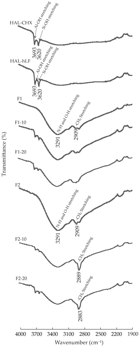 The main bands of the NHs can be observed in the spectra of the loaded films, thus confirming the hybrid inorganic/organic nature of the formulations. Concretely, bands of hydroxyl stretching vibrations of HAL at 3693 cm−1 (inner Al-OH) and 3620 cm−1 (outer Si-OH) were identified. A broadening and slight intensification of the CH2 stretching band was also observed in F1-20, while in F2-10 and F2-20, this band was intensified and shifted slightly to lower values (2883 cm−1 in F2-20). These results could suggest hydrogen bonding interactions between the NHs and the CS and HC chains in the loaded films. Specifically, doubling the NH mass could increase the surface area available for hydrogen bonding, thus probably generating a greater number of hydrogen bonds in the resulting films. Hence, the F2-20 film, with greater NH content, might be characterized by a more extensive hydrogen-bonding network, resulting in greater shifts in the CH2 stretching wavenumber compared to the F1-10 films. Overlapping of the remaining principal bands of the components did not allow for the identification of more shifts in the wavenumbers of the vibrations coming from interactions between NH and organic components.