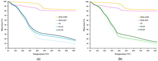 TGA measurements confirmed the hybrid nature of the films and defined their thermal stability and degradation behavior. This information is relevant to determining how the films will behave under different conditions, including environmental exposure, which is crucial to maintaining functionality in wound care. TGA curves of the films and NHs are plotted in Figure 9a,b. The thermal behaviors of the F1 and F2 films and NHs were consistent with the literature [19,20,51]. The mass loss in F1 and F2 curves was associated with the loss of superficial water and the degradation of acetic acid residues (at 35 to 200 °C). At higher temperatures, dihydroxylation, the loss of absorbed water molecules of HC, and the combustion of organic matter took place. NHs showed steps of residual moisture loss (at 35 to 100 °C), denaturation and/or degradation of the antimicrobial agents (>230 °C), and dehydroxylation of the aluminol groups of HAL (at 400 to 550 °C). Regarding the NH-loaded films, intermediate profiles were observed between the curves of the corresponding unloaded films and the NHs, which confirmed the existence of organic and inorganic phases in the films. Moreover, comparing the residual masses of the NH-loaded films and their corresponding unloaded formulations, thermal stability could be gained when the NHs are incorporated into the film structure. In fact, at the end of the heating (960 °C), NH-loaded Group 1 films had 15.7% (F1-10) and 17.8% (F1-20) mass residues vs. 8.6% of F1. A similar behavior was found for Group 2, where NH-loaded films showed residual masses of 10.4% (F2-10), and 13.7% (F2-20) vs. 4.1 (F2). The highest thermal stability was obtained at the greatest NH content (F1-20 and F2-20). The thermo-stabilizing effect of nanoclay particles in HAL/CS [45] and HAL/CS/PVA/PVP films has been previously hypothesized [48]. HAL nanotubes may limit the mobility of CS chains, and volatile degradation products must bypass the tortuosity offered by clay particles, thus delaying a mass transfer.