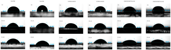 In each formulation, contact angles (θ) of water, formamide and diiodomethane on the films were measured. Representative images are shown in Figure 10.