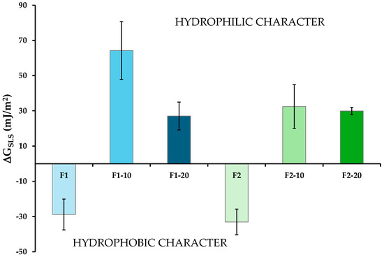 The results demonstrated that the addition of NHs to the films generated hydrophilic surfaces. As can be observed in Figure 11, the hydrophobic nature of F1 and F2 (negative ∆GSLS) changed to hydrophilic (positive ∆GSLS) in all the NH-loaded films. Regardless of the formulation group, the hydrophilic character did not increase significantly at the greatest NH concentrations. This behavior might be due to the higher presence of peaks in the films loaded with NHs, as observed in the topographical images obtained via AFM. The hydrophilic/hydrophobic properties of films depend, among other factors, on their texture. This characterization is consistent with previously published data [46], postulating that the θ of water in HAL/sulfated galactan bio-nanocomposites decreases as the clay mineral content increases (up to 15%). At high concentrations, the aggregation of inorganic nanoparticles may lead to an increase in surface roughness, limiting further increases in the hydrophilic characteristics of the formulation [68].