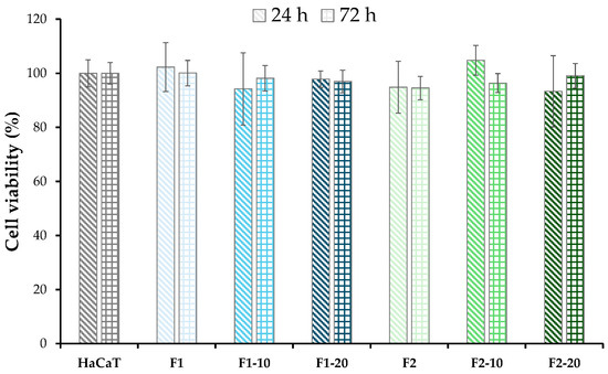 Cytotoxicity measurements were carried out as proof of concept regarding the safety of these films in the treatment of skin wounds. Relative cell viability values (RCV, %) of HaCaT are plotted in Figure 12 after up to 72 h of incubation with the unloaded or the NH-loaded films. In all films, RCV was ≈100%, with negligible differences between 24 h and 72 h when compared to the positive control. These results suggested the lack of toxicity of the films with HaCaT cells. No significant differences were defined between NH-loaded films and unloaded films. This suggested that cell viability was not hindered by the NHs at any of the concentrations investigated. The cytocompatibility of the NHs was also demonstrated in human fibroblast cultures [19,20].