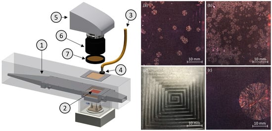 A schematic overview of the experimental setup with the drying channel and the equipment for the observation of nucleation and growth is drafted on the left-hand side of Figure 1. To make nucleation and growth visible, a halogen light source with a flexible light guide (KL 1500 LCD; Schott Glas Fiber Optics Division, Mainz, Germany) was placed above the drying channel and the light was polarized using an optical filter (XP40HT-40; Edmund Optics, Mainz, Germany). The thin film was observed through glass planes in the drying channel using a camera (Leica EC4; Leica Microsystems GmbH, Wetzlar, Germany, resolution: 13 µm), a zoom lens (Pentax Cosmicar TV 12.5–75 mm; Pentax Ricoh Imaging GmbH, Hannover, Germany), and a rotatable polarizing filter (Olympus U-POT Polarizer; Evident Europe GmbH, Hamburg, Germany), which was placed in front of the lens. The polarizing filter was rotated for the observation in such a way that the transmission in the amorphous area of the thin film was minimized and the crystals formed were visible in good contrast by their optical activity. To reduce reflections, the surface of the milled cavities on the sample holding platelet was treated with 4 mL of 10% HCl, for 20 min. Images (a) to (c) on the right-hand side of Figure 1 show partially crystallized thin films for different drying conditions under the polarized light and treated surface whereas image (d) exemplarily shows an unetched, reflecting platelet (not used) under unpolarized light. Preliminary, comparative experiments with unetched and etched platelets showed that the surface treatment had no effect on crystallization behavior.