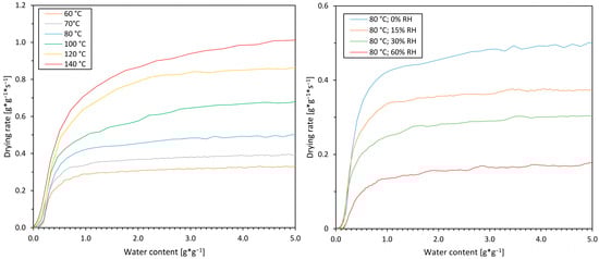 The drying kinetics for experiments with varying drying air temperatures and dry air is shown on the left-hand side of Figure 3, while the drying kinetics for different air humidities at a constant temperature of 80 °C is displayed on the right-hand side.