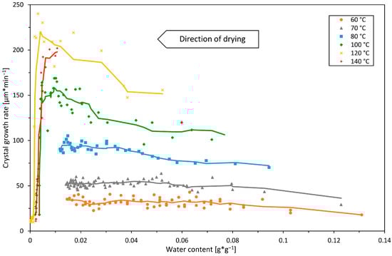 However, high air temperatures above 100 °C led to a rapid inhibition of the growth at water contents of around 0.01 g*g−1. This reduction in the growth rate stems from the exceedingly high viscosity and limited molecular movement inherent in highly concentrated solutions and is in line with the findings of Hartel [] and Chen et al. [], who observed a similar reduction in growth rates in sucrose–corn syrup mixtures above concentrations of 95%. At lower temperatures, however, respectively, at 60, 70, and 80 °C, no such growth rate inhibition could be observed. Therefore, our experimental data suggest that the water content during drying is always in a range at which the sugar concentration is not yet so high that growth is distinctively restricted by viscosity.