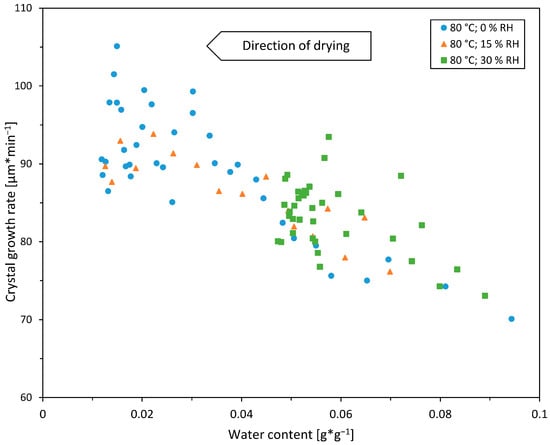 Crystal growth rates for a drying temperature of 80 °C and at three different air relative humidities of 0%, 15%, and 30% RH. Drying with a relative humidity of 60% did not show crystallization. The velocity of drying air was 0.3 m*s−1.