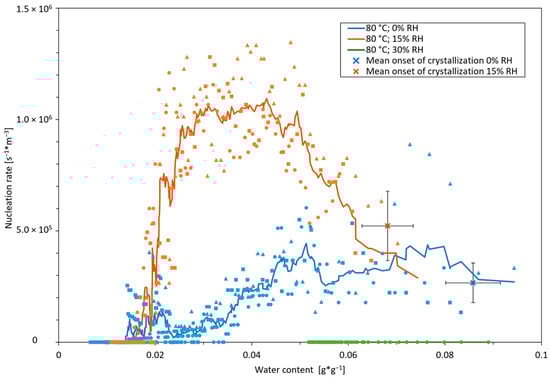 Nucleation rates and onsets for thin-film drying of sucrose solution at 80 °C at three different air relative humidities of 0%, 15%, and 30% for 80 °C. Initial water content was 9 g*g−1 and sample mass was 1.7 g. Drying air velocity was 0.3 m*s−1. Different symbols denote different experiments; error bars denote mean absolute errors.