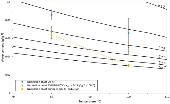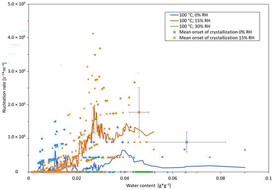 To investigate the nucleation behavior at a different temperature level, it was further investigated by means of experiments at 100 °C at three different air humidity ratios, xair of 0, 0.111, and 0.270 g*g−1. The onset of nucleation and nucleation rate are depicted in Figure 7.