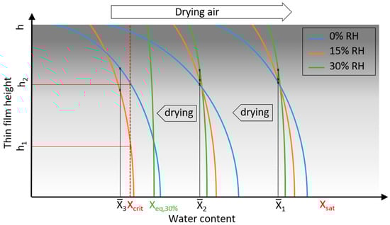 Yet, of particular interest is the explanation of the cause of the strong observed influence of drying conditions on the nucleation rate and onset. At concentrations above the metastable zone, homogenous nucleation can occur in principle and, as observed, the extent of nucleation (and growth) depends on the prevailing supersaturation. However, concentration is not uniformly distributed inside the drying film due to the rapid drying process but there are differences between the film surface, which is subject to moisture transfer to the air, and the deeper layers with higher water contents. During progressed drying, this results in a more or less pronounced crust formation at the product surface []. As a consequence, concentration differences (or different local supersaturation values) prevail for different heights inside the film. The deviation between the average water content and the local water content at the surface increases with faster drying. The different nucleation behavior in terms of the onset and rate depending on the humidity of the drying air can yet be explained by these different vertical concentration differences prevailing in the film at different stages of drying, as illustrated schematically in Figure 8.