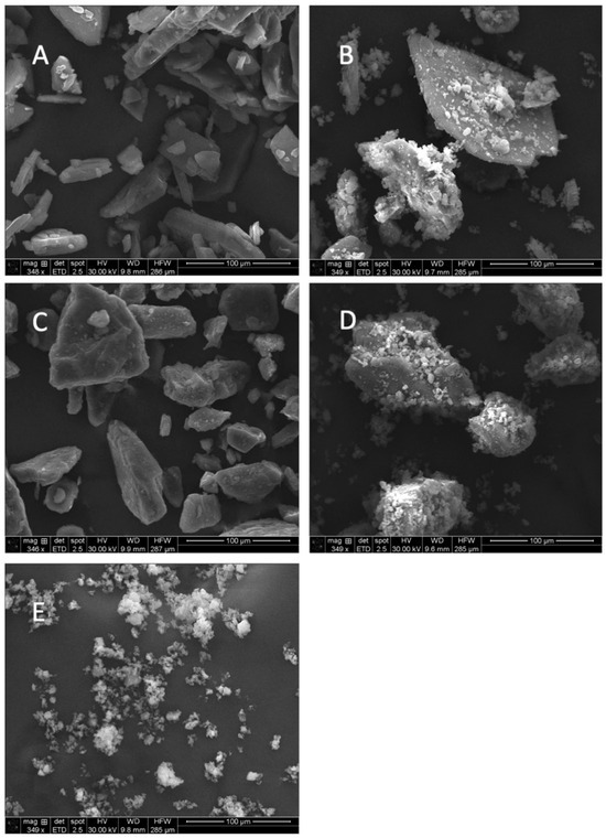 Particle size distributions (Figure 1 and Table 1) showed a single peak for micronized indomethacin and a bimodal distribution for the indomethacin–lactose formulation and the fine indomethacin–coarse indomethacin formulation. Regarding the carrier particles, lactose was demonstrated to be larger in size (D90 of 116.1 µm) as compared to coarse indomethacin (D90 of 42.5 µm). Scanning electron microscopy revealed a difference in the particle morphology (Figure 2). Lactose carrier particles were, as expected, tomahawk-like structures [24], while coarse indomethacin were plate-like structures [25]. Upon the addition of micronized indomethacin, both blends showed significant coating of the micronized indomethacin on the respective carrier (Figure 2A and Figure 2B, Figure 2C and Figure 2D, respectively).