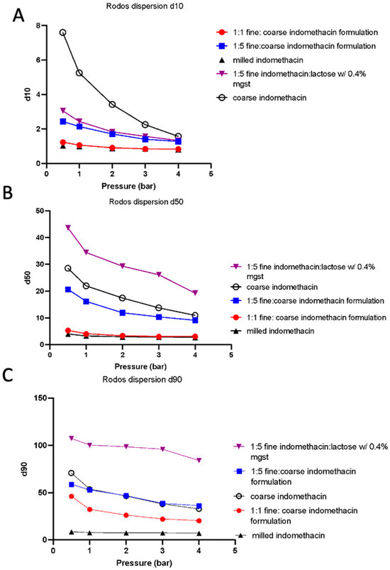 RODOS dispersion of indomethacin formulations. (A) D10, (B) D50, (C) and D90. Blends described are formulated as (w/w).