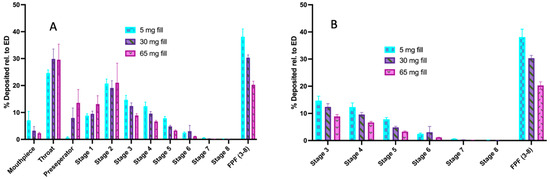 Fine particle fraction of pure micronized indomethacin at increasing fill weights. (A) Total aerosol performance. (B) Aerosol performance on stages 3–8.