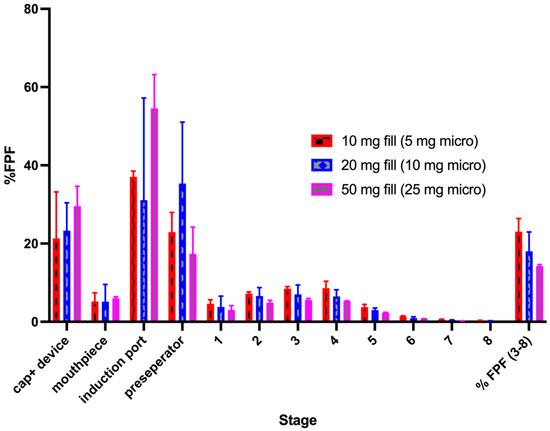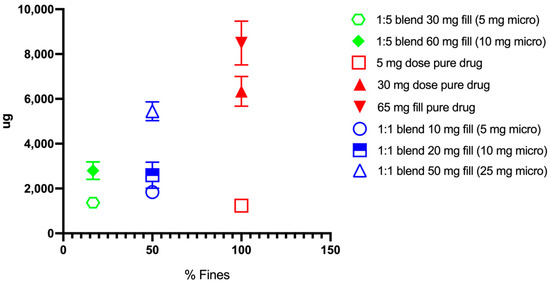 Despite the general decreases in efficiency, as quantified by FPF, the fine particle doses of the pure micronized drug and the 1:1 blends were found to have FPDs above 3 mg (see discussion below), as shown in Figure 6.