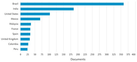 A search conducted in the Scopus database on 6 June 2023, using the search string “(bixa OR bixaceae OR ‘bixa orellana’)” identified a total of 4271 documents. This substantial number of publications highlights the interest and relevance of topics related to Bixa orellana within the scientific community. Among these documents, the following regions/countries with the highest academic production stand out: Brazil > India > United States > China > United Kingdom > Mexico > Malaysia > Egypt > Spain > France. Notably, Brazil leads the production with 1018 publications, representing 23.83% of the total, followed by India with 17.91% of the contributions. This can be observed in Figure 1.