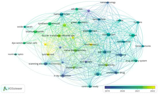 By performing a bibliometric analysis of the results from the most recent search in the Scopus database, using VOSviewer 1.6.18 software, it was possible to identify 93 relevant terms. This survey was carried out considering the co-occurrence of at least five terms using “full count” settings. Figure 2 illustrates the interconnection of three distinct clusters among the most frequently used terms. Among these terms, the prominent interest of the scientific community in the topic evaluated by concepts such as plant extract, particle size, and nanoparticles stands out.