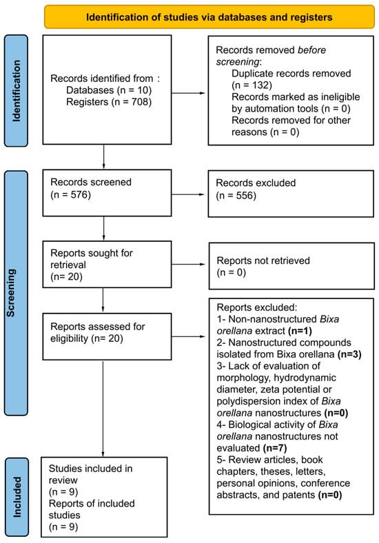Studies were excluded for the following reasons: (I) Studies of non-nanostructured Bixa orellana. (II) Studies that performed nanostructuring of compounds isolated from Bixa orellana. (III) Studies that did not evaluate the parameters of morphology, hydrodynamic diameter, zeta potential, or polydispersion index of nanostructures. (IV) Studies that did not evaluate biological activity or toxicological profile of Bixa orellana nanostructures. (V) Review articles, book chapters, theses, letters, conference abstracts, and patents.