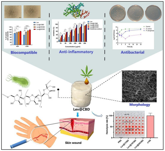 Novel, porous, antibacterial, levan-based sponges fortified with cannabis oil have demonstrated improved biocompatibility with L929 mouse fibroblasts and human dermal fibroblasts cells, enhanced anti-inflammatory potency, and antibacterial activity against Staphylococcus aureus and Pseudomonas aeruginosa. * p < 0.05, ** p < 0.01, *** p < 0.001, ns = non significant. These properties suggest excellent wound-healing efficacy. These pictures are reproduced with permission from [117] under a Creative Commons Attribution (CC-BY) license.