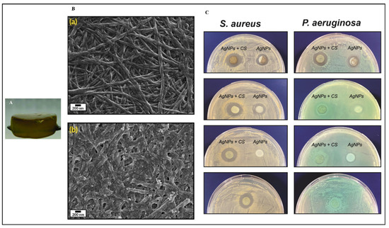 Collagen-based hydrogel fortified with silver nanoparticles and Cannabis sativa oil (A); scanning electron microscopy images of collagen hydrogel (Ba); and silver nanoparticles with C. sativa oil incorporated into the collagen hydrogel (Bb); as well as the antimicrobial efficacy of these hydrogels at varying concentrations against Staphylococcus aureus and Pseudomonas aeruginosa compared to control collagen (C). These pictures are reproduced with permission from [118] under Creative Commons attribution (CC-BY−4.0) license.